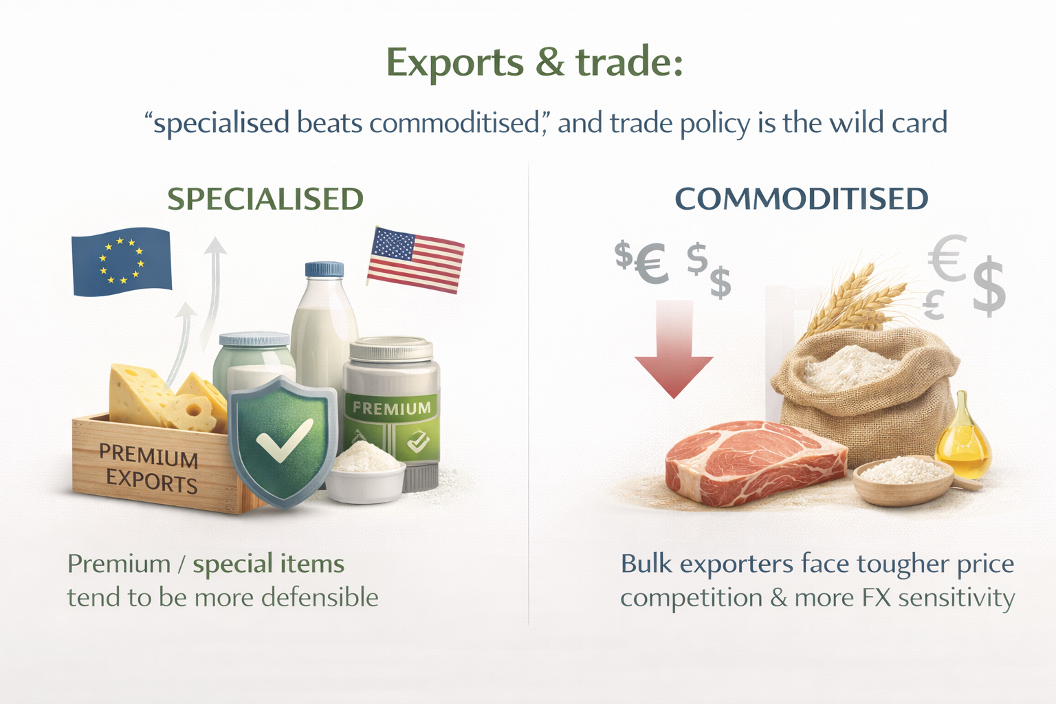 6) Exports & trade: “specialised beats commoditised,” and trade policy is the wild card