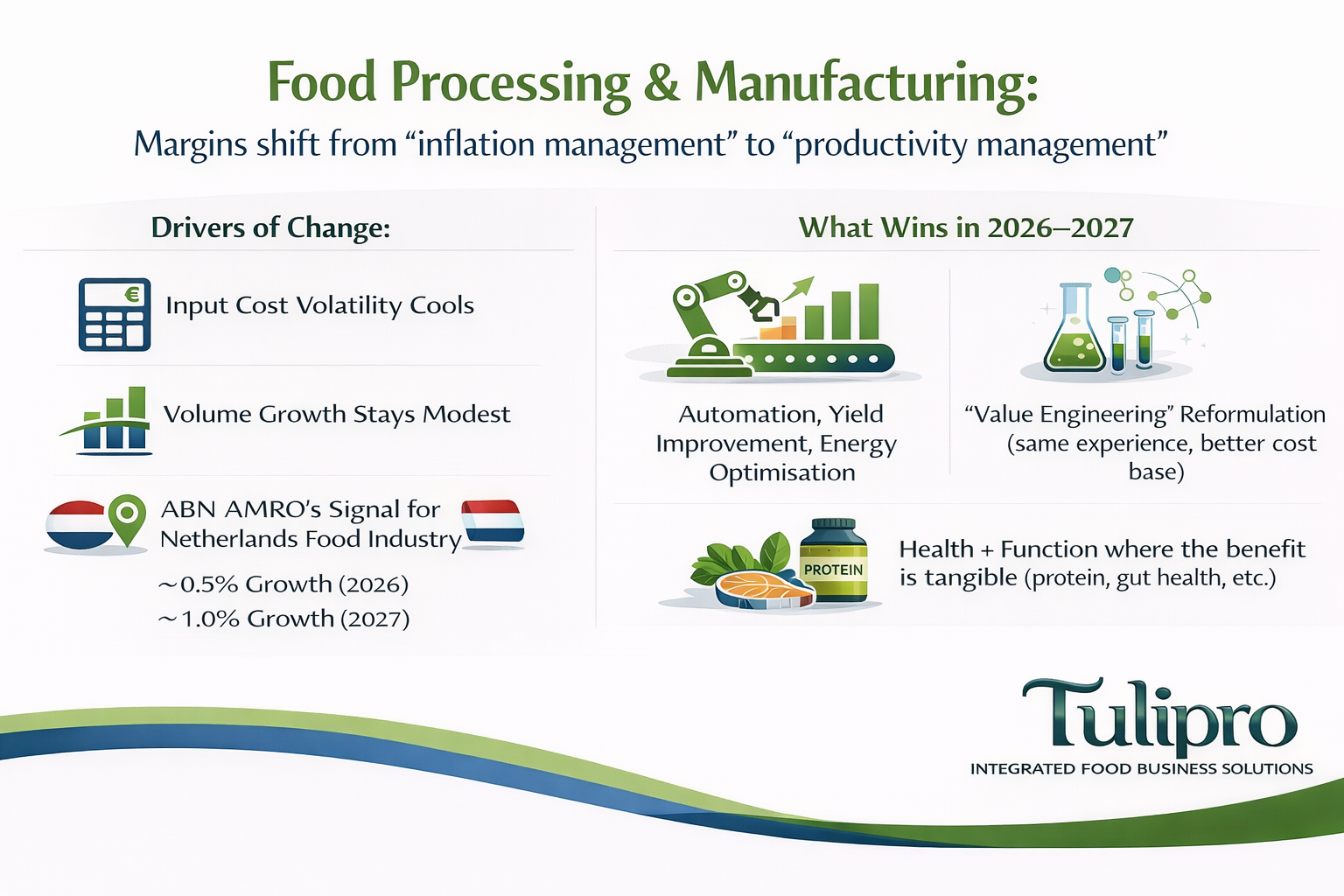 A useful signal from ABN AMRO: for the Netherlands, food industry growth is expected around ~0.5% in 2026 and ~1% in 2027 (not Europe-wide, but directionally consistent with “low growth”).